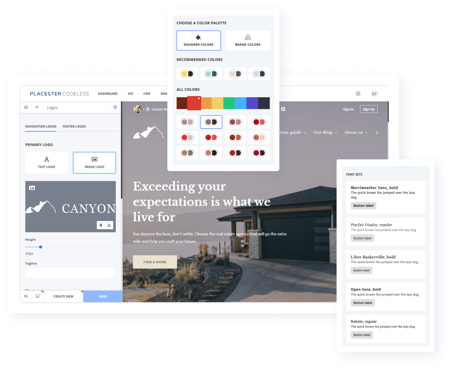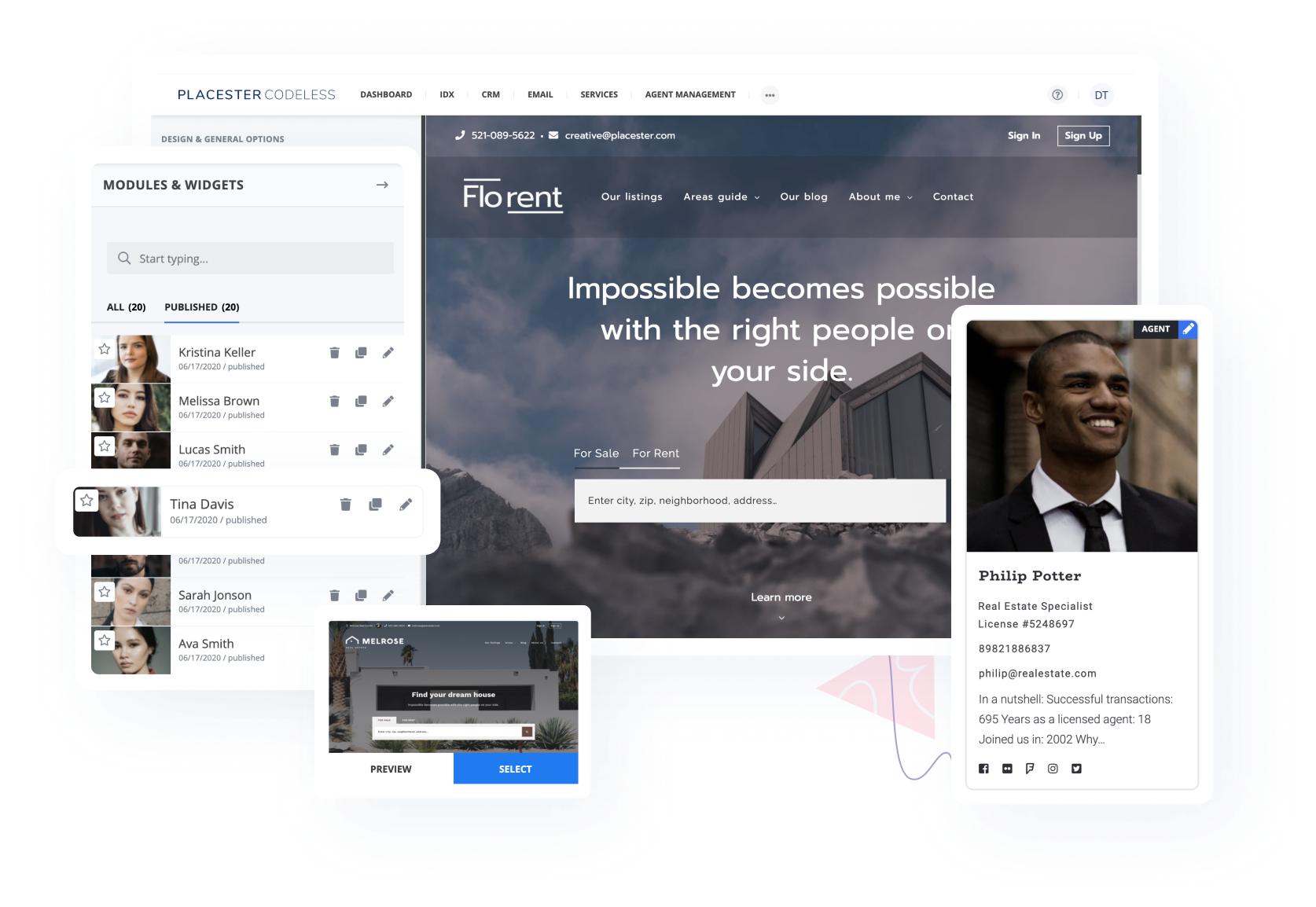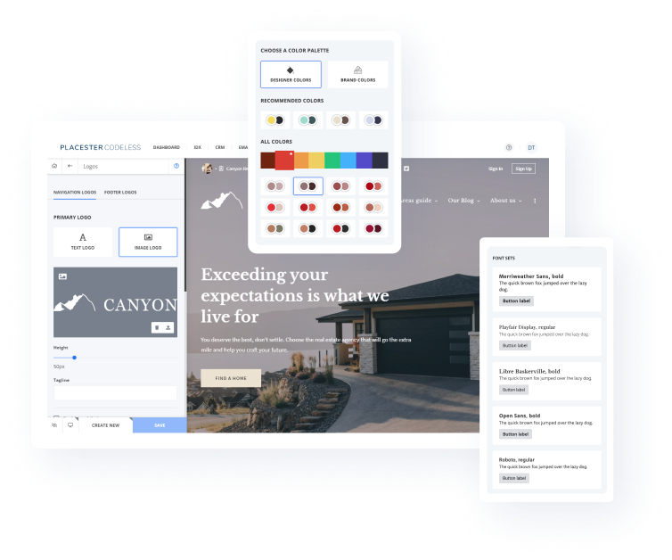 Use Placester’s code-free website customizer to create pixel-perfect websites. Professional designs and starter layouts make it easy for anyone to create, customize, and manage powerful real estate websites.