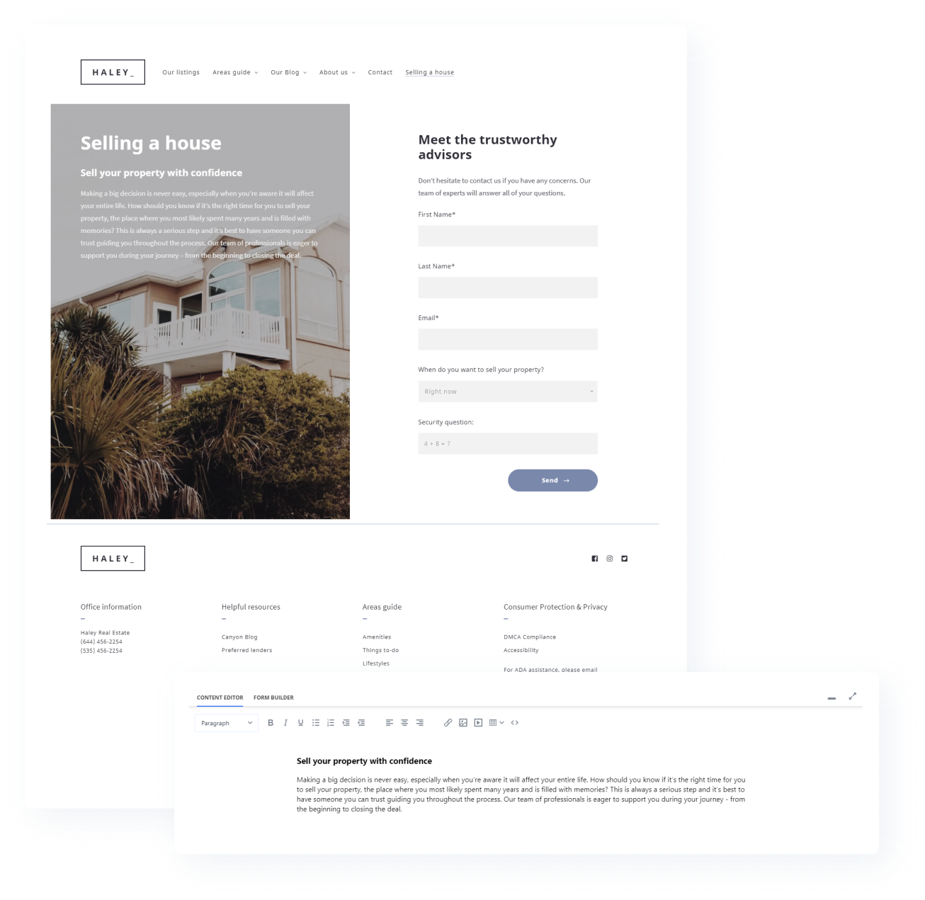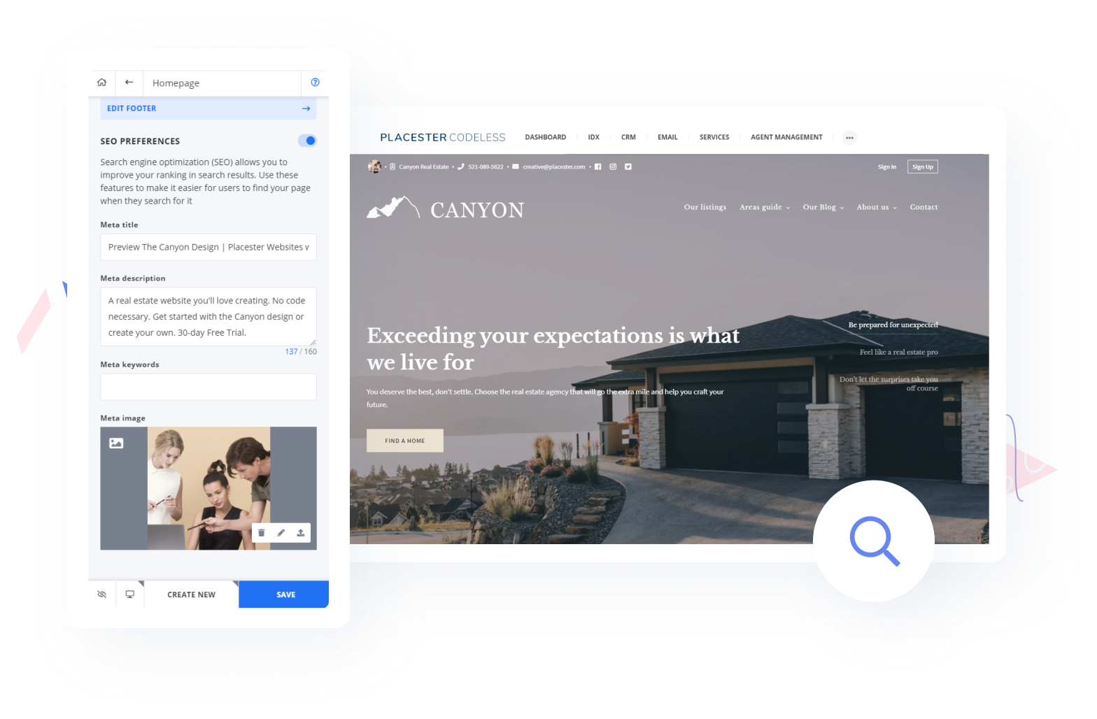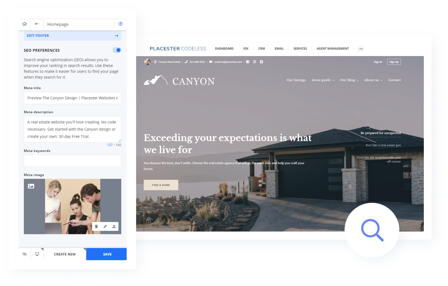 Use Placester’s code-free website customizer to create pixel-perfect websites. Professional designs and starter layouts make it easy for anyone to create, customize, and manage powerful real estate websites.