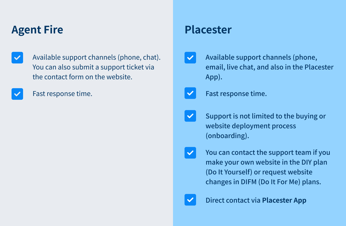 Generally, the Pricing packages look similar, so you need to pay attention to the level of support. Under the hood, Placester and Agent Fire are fundamentally different companies because Placester invested the time and energy to build a product that makes it incredibly easy to support you so you get an excellent experience. When you buy Placester Do It for Me products, it literally means that you can have unlimited changes to your website any time you want to be done by a human.