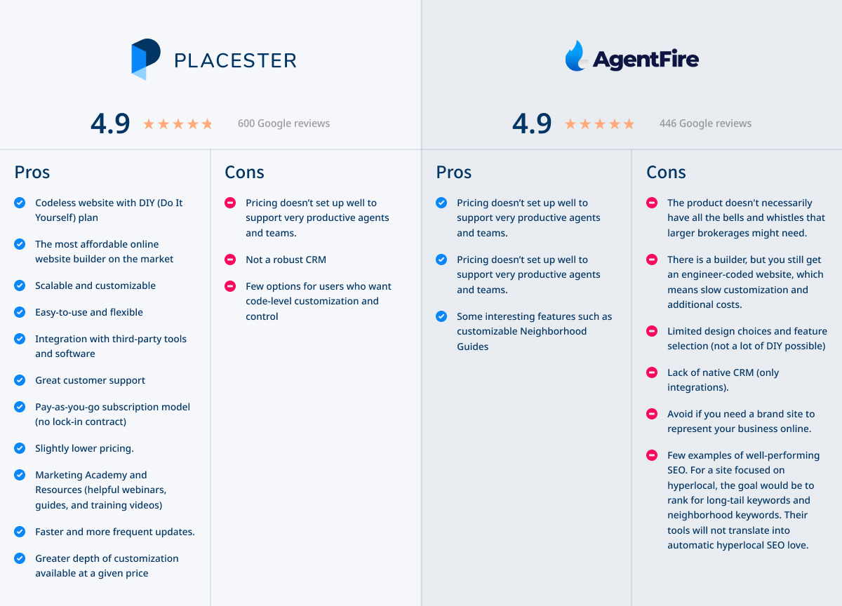 If you're an agent who wants to grow your business, Agent Fire and Placester are both very strong contestants worth checking out. But which one is a better fit for your real estate business? Let’s compare their offers to see.