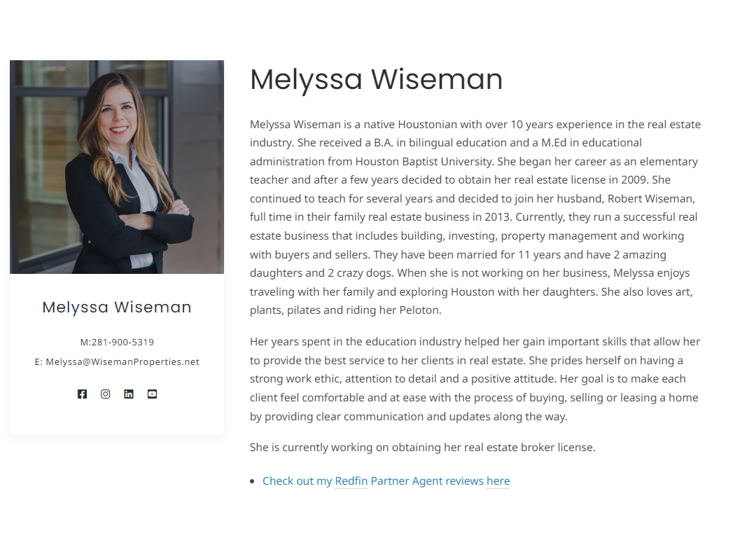 Don’t forget about the bio section, where you introduce yourself to the prospects and share your professional experience with them. If you struggle with writing one, jump to our new article on how to write an outstanding real estate agent bio or use one of our templates.