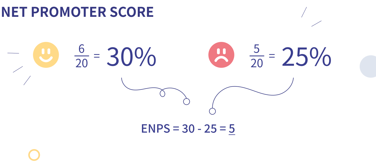 For example, say I survey 20 agents. 6 of my agents are Promoters, 10 are Passives, and the remaining 4 are Detractors. My eNPS would be 5 (30%-25%). That calculation looks like this: