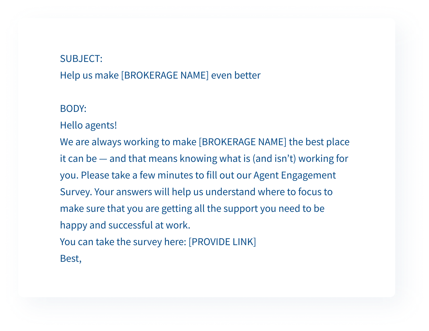 When you’re ready to kick off your Agent Engagement Survey, make sure your agents are engaged in the process. This is all about them, after all! We recommend launching the survey with an upbeat email to the team, something like this: