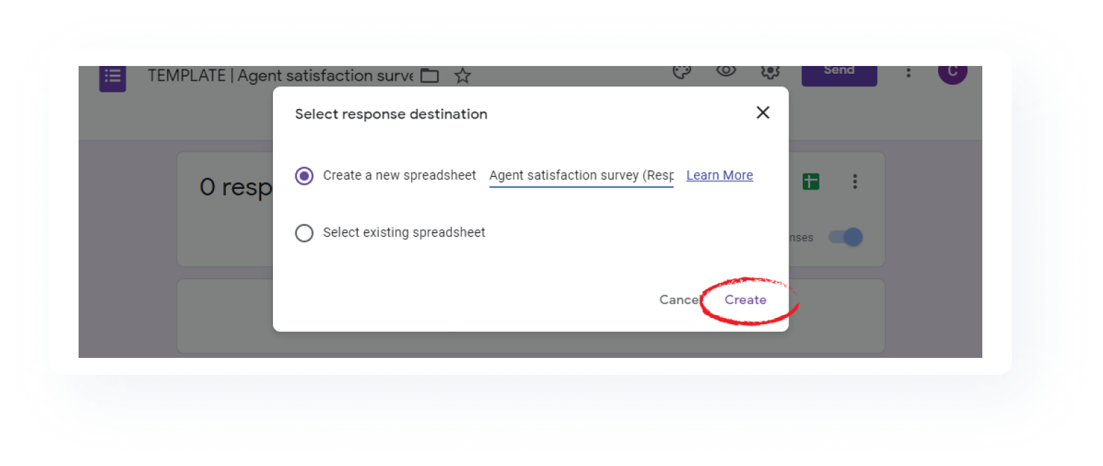 In the prompt, click Create. Open it right away, and give your spreadsheet a name you will remember, like “Agent Engagement Survey, Summer 2021.”