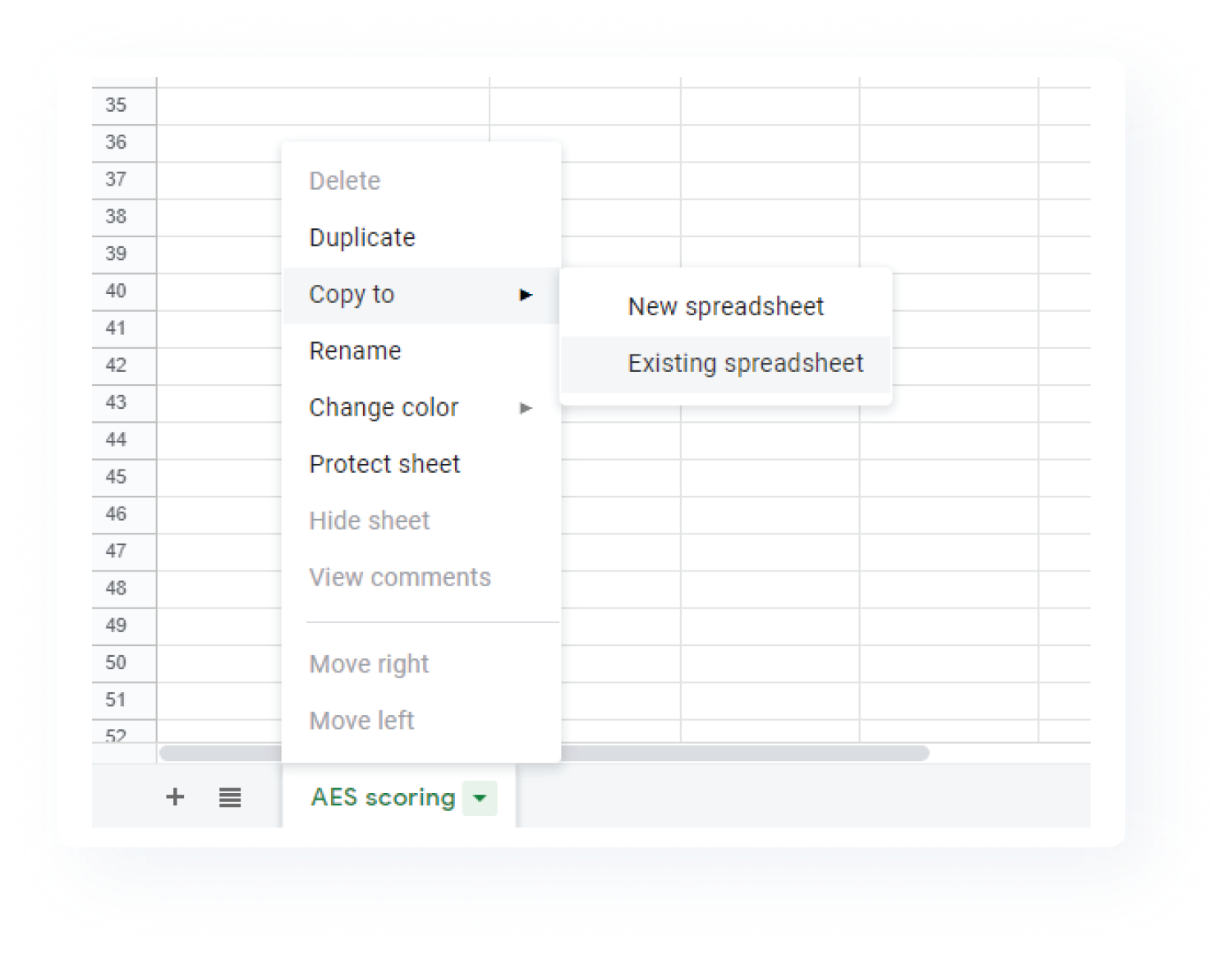 Open the options on the AES Scoring tab, and select Copy to > Existing Spreadsheet, then choose the responses sheet you created and named in step 2: