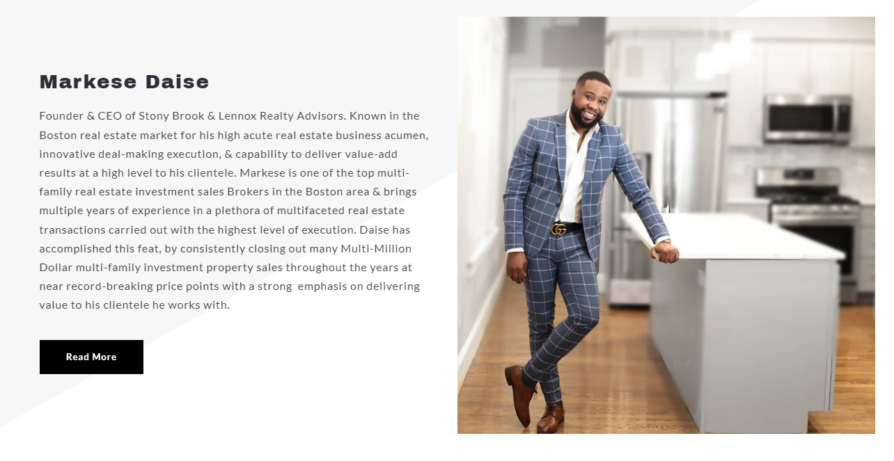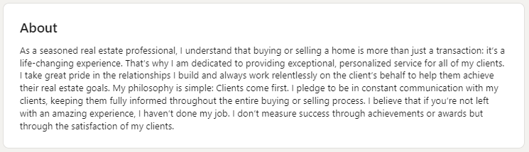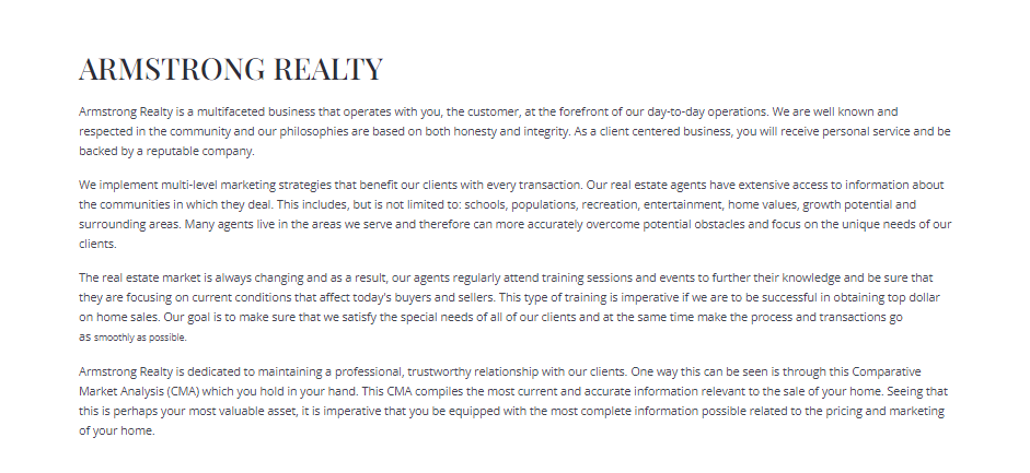 Armstrong Realty has a perfect bio section that is split into four legible paragraphs. The first paragraph is dedicated to their vision and how they conduct their business. The second paragraph is dedicated to value - what the client gets when they decide to work with the team members. The third section outlines the clients’ profile - Armstrong Realty will work with both first-time buyers, sellers with summer properties or investments. The last paragraph is dedicated to how the relationship continues to exist even after the deal is closed.