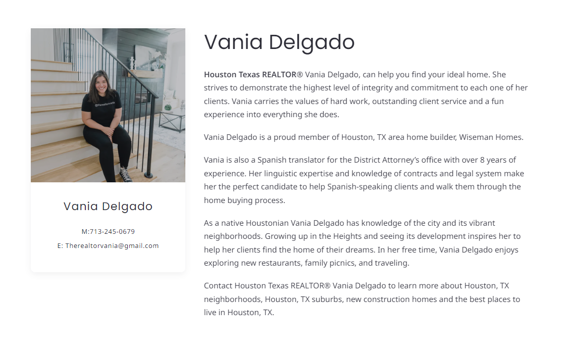 Show what you can do for your clients - Vania Delgado dedicated the whole first paragraph to her unique value proposition as a real estate agent, which is a promise to help her clients find their dream house and display commitment and integrity during the cooperation.