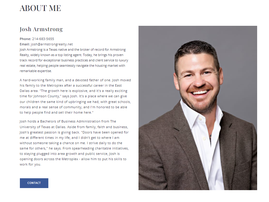 As you can see in the example above, Texas-based Josh Armstrong lets his personal background and mission shine in his real estate agent bio, however, he makes his professional accomplishments known at the same time. To make the text easier to read, it has been split into three paragraphs - thanks to it, the structure of the text is well organized and logical.