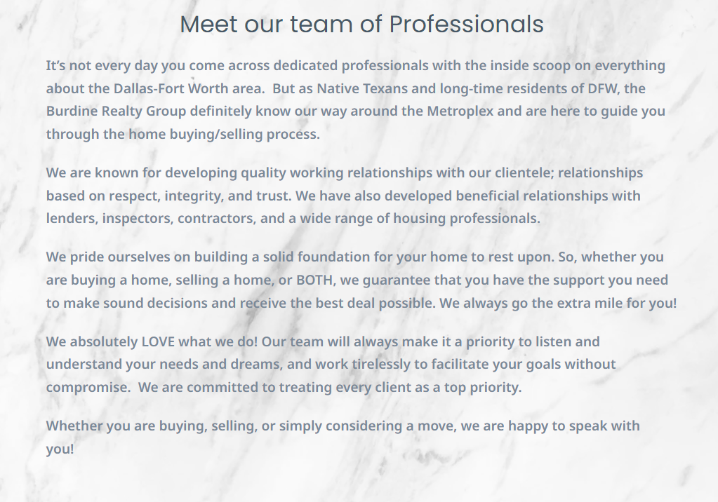 Burdine Realty let their team spirit be known in the first sentences of their bio section. They convincingly tell their story as a team and what they pride themselves on as well as show how passionate they are about their work.