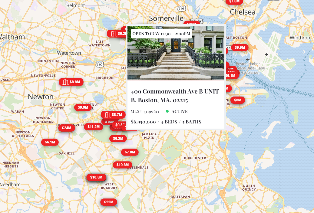 - With this layout selected, you'll see listing pins populated on the map view. These pins will display key details like listing prices, open house markers, and links to virtual 3D tours when available. Color of the pin is related to the primary color of your website.