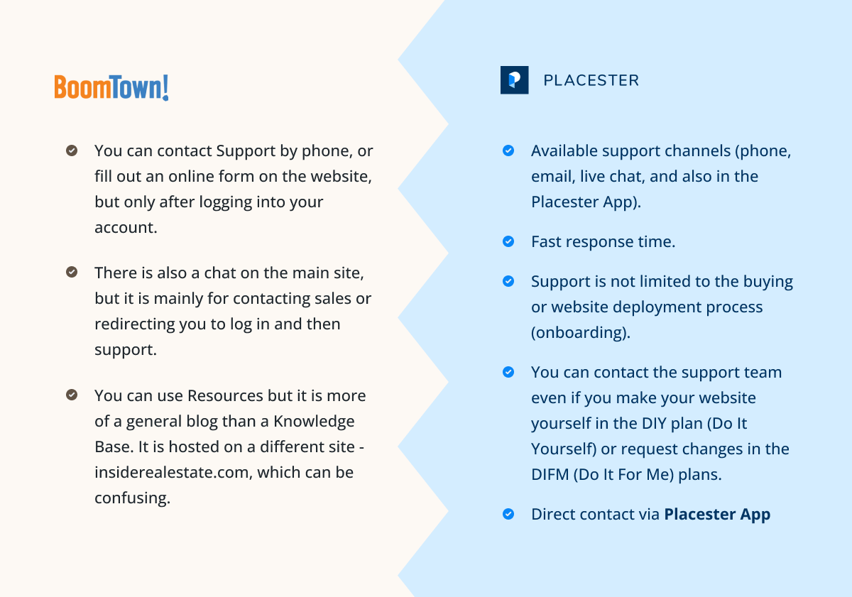 The reason you want to go with Placester is to stay flexible and save money. The number one advantage is that in Placester, you will get a business partner. Everything that's hard about working with other providers is incredibly easy and enjoyable in Placester because you are messaging a human being and having a real conversation! You get a concierge-level service experience at a great price point with tons of features that make Placester an easy choice.