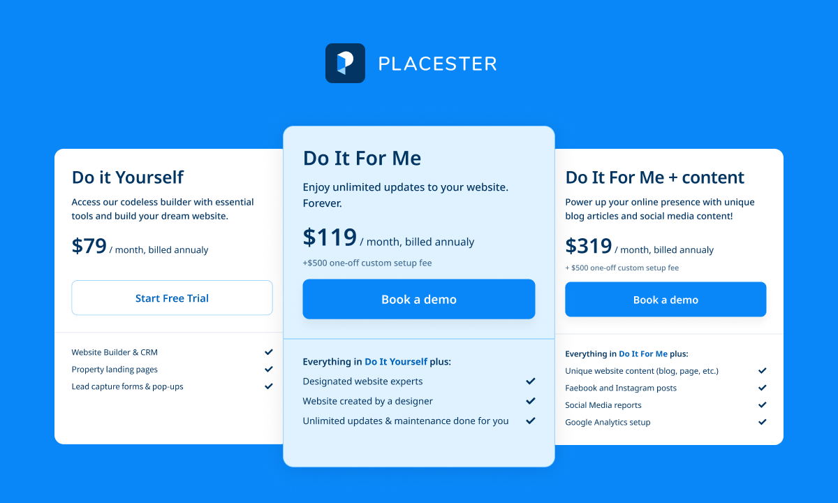 - Placester offers 3 plans: