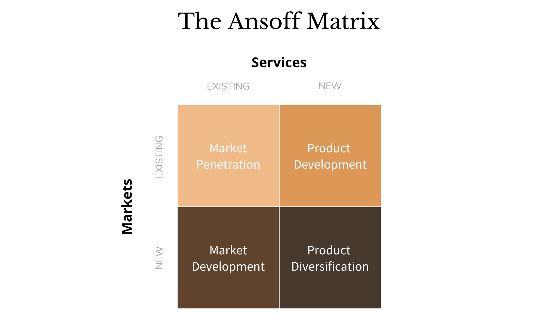 The Ansoff Matrix is a diagram with four possible alternatives for business growth: market penetration, market development, product development, and diversification.