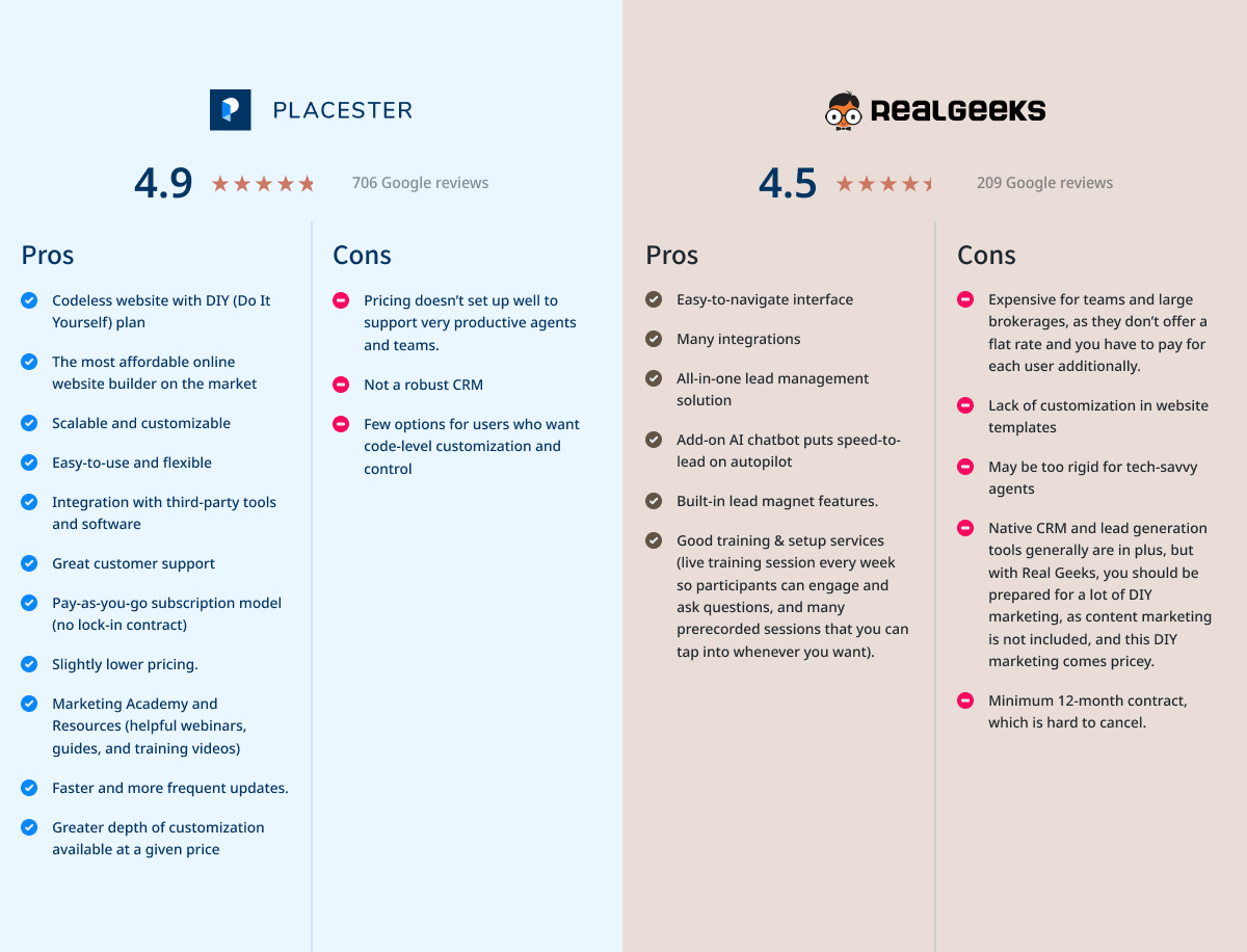 If you're an agent who wants to grow your business, Real Geeks and Placester are both very strong contestants worth checking out. They offer various features and tools, but they also have some key differences. Real Geeks is explicitly designed for lead generation, while Placester focuses on providing a complete real estate website solution. But which one is a better fit for your real estate business? Let’s compare their offers to see.